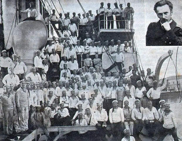Команда крейсера «Очаков» за две недели до восстания 1905 г. и лейтенант Шмидт (в верхнем правом углу)