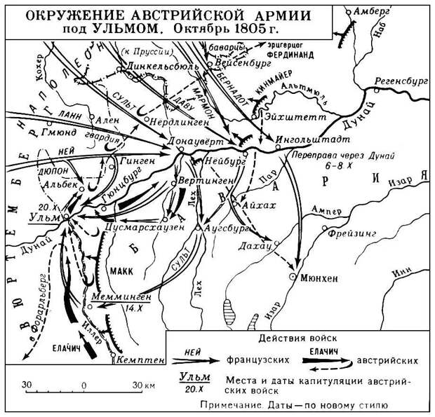 6 октября французские войска вышли к берегам Дуная позади правого фланга основных сил австрийцев. Грандиозный стратегический охват удался. «Маленький капрал, кажется, избрал новый способ ведения войны, — шутили солдаты, — он воюет нашими ногами, а не штыками».