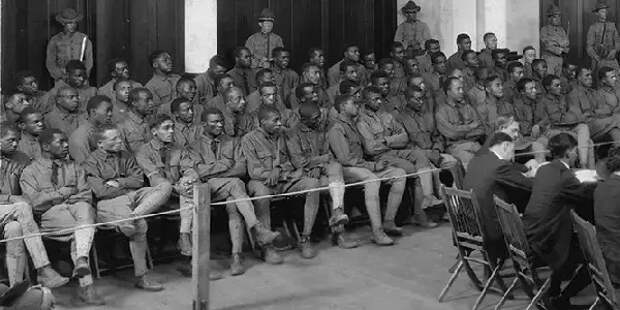 Сцена во время военного трибунала над 64 военнослужащими 24-го пехотного полка, обвиняемыми в мятеже и убийстве 17 человек, состоявшегося в Форт-Сэм-Хьюстоне, штат Техас, 23 августа 1917 года. В соответствии с законами Джима Кроу того времени, 118 солдат предстали перед тремя военными трибуналами. Это был крупнейший судебный процесс по делу об убийстве в истории США, где было осуждено 110 человек, из которых 19 были казнены в ходе массовой казни, а 63 были приговорены к пожизненному заключению. Источник: National Archives (NARA)