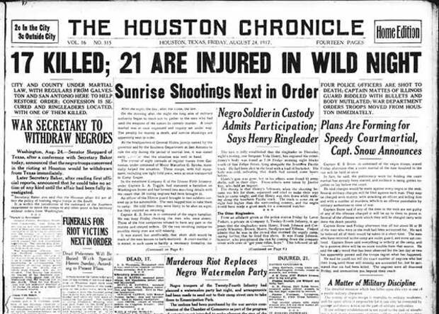 23 августа 1917 года после полицейского рейда на игру в кости, организованную неграми, полиция арестовала чернокожую женщину, хозяйку незаконного казино, а затем арестовала чернокожего солдата, который пытался вмешаться. Слухи о полицейском беспределе достигли военного лагеря, где черные солдаты захватили оружие, а затем вошли в Хьюстон. Среди погибших в результате насилия были белые полицейские, солдаты и гражданские лица, а также четверо чернокожих солдат...