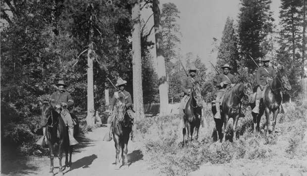 До того, как в 1916 году была создана Служба национальных парков (NPS), армия США отвечала за защиту и управление первыми национальными парками. В конце XIX-го и начале XX-го веков войска, состоявшие из негров и получившие известность как «Солдаты Буффало» (Buffalo Soldiers), служили во многих важных местах на западе Соединенных Штатов. «Солдаты Буффало», наряду с другими армейскими войсками, сыграли ключевую роль в развитии системы национальных парков, где они патрулировали отдалённые районы, строили дороги и боролись с браконьерством, функции которых позже взяли на себя рейнджеры парков. На этой фотографии 1899 года «солдаты Буффало» из 24-го пехотного полка несут конное патрулирование в Йосемитском национальном парке (Калифорния). Источник: свободный доступ.