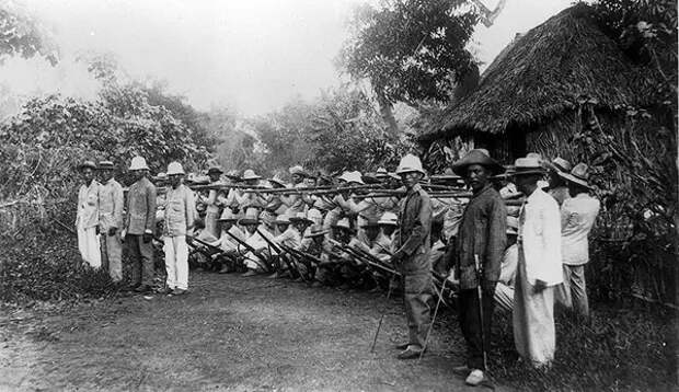 После поражения Испании в испано-американской войне Испания по Парижскому договору в декабре 1898 года передала контроль над Филиппинскими островами Соединенным Штатам, но после ратификации этого договора на островах начались боевые действия между войсками США и филиппинскими националистами (1899-1902). Изначально военное ведомство выражало опасения, что чернокожие солдаты могут отказаться от участия в этой войне, поскольку им придется сражаться с угнетенным меньшинством. Многие негритянские газеты и лидеры поддерживали независимость Филиппин и считали, что чернокожие солдаты будут использоваться в несправедливой расовой войне. Тем не менее, первая волна черных войск прибыла на Филиппины в середине июля 1899 года. «Солдаты-буффало» охраняли небольшие деревни и военные базы, чтобы поддерживать спокойствие в городах. В то время как большинство чернокожих солдат оставались верными своему долгу, около тридцати солдат дезертировали, а некоторые даже присоединились к филиппинским повстанцам, среди которых был рядовой Дэвид Фейген, бывший член Двадцать четвертого пехотного полка, ставший капитаном в филиппинской армии и доставляющий неприятности армии США до самой своей смерти. Источник: Библиотека Конгресса США.