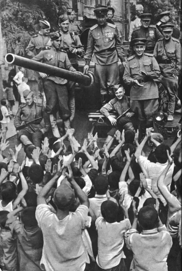 Китайцы приветствуют советских танкистов в освобожденном городе Далянь (Дальний)