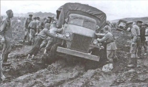 Бойцы Забайкальского фронта вытаскивают из грязи, застрявшие «Студебеккеры», август 1945 года