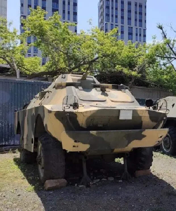 Рядом с БТР-60ПБ стоит бронированная разведывательно-дозорная машина БРДМ-2, из башни которой вместо штатной «спарки» 14,5-мм КПВТ и 7,62-мм ПКТ торчит какая-то тонюсенькая трубка.