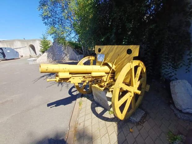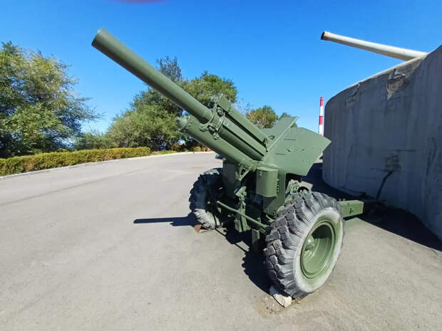 Недалеко от входа на батарею у передней бетонной стенки каземата стоит 122-мм гаубица М-30 образца 1938 года. Орудие оснащено новыми колёсами с неродными протектированными шинами и радует глаз свежей краской.
