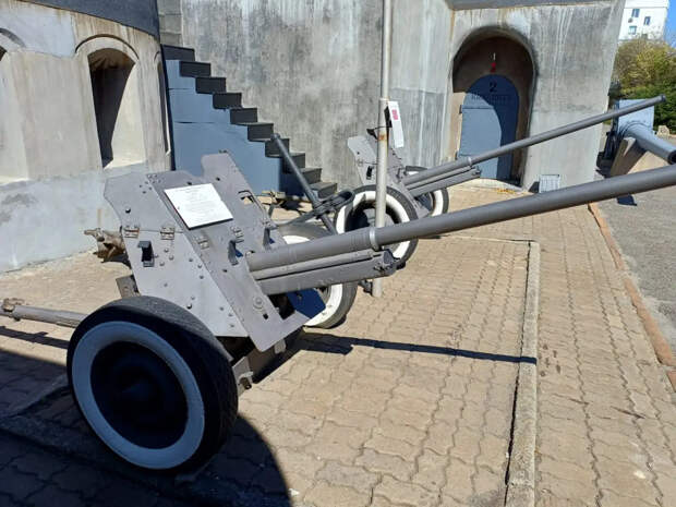 У второго перестроенного орудийного дворика рядом с флагштоком стоят два 45-мм противотанковых орудия М-42 образца 1942 года. При массе в боевом положении 625 кг эти компактные пушки на поле боя перекатывались силами расчёта из 5 человек. Скорострельность достигала 25 выстр./мин.