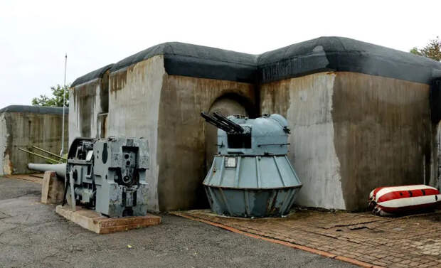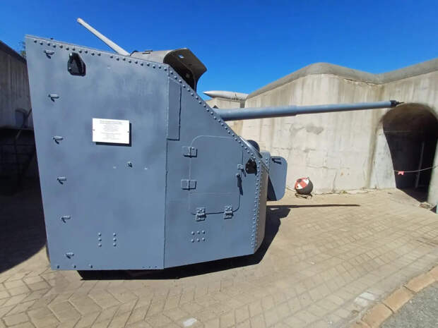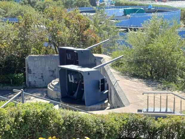 Справа от входа на левом фланге, где когда-то размещались 57-мм скорострельные пушки, сейчас установлены советские универсальные 85-мм корабельные артиллерийские установки 90-К, реальных огневых позиций которых здесь никогда не было.