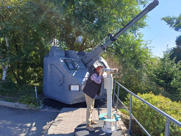 Напротив лестницы, ведущей на основную площадку батареи, установлена 76-мм корабельная артиллерийская установка АК-176, а рядом с ней бинокль с широким полем зрения, закреплённый на штативе, в который можно обозревать прибрежную акваторию.