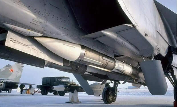 Ну и оружие было под стать оснащению. Таким оружием стали ракеты большого радиуса действия Р-33 с максимальной дальностью поражения целей 120 км. Это были самые дальнобойные ракеты прошлого века. Четыре ракеты в полуутопленном положении крепятся к нижней поверхности фюзеляжа, и еще есть подкрыльевые пилоны — по два под каждой плоскостью. Восемь ракет — более чем достаточно для отражения любой угрозы.