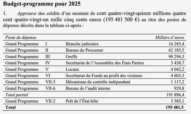 Основываясь на внутренних документах МУС, касающихся его бухгалтерской отчетности, мы можем констатировать, что его бюджет только на 2025 год составляет 195 481 500 евро (резолюция ICC-ASP/23/Res.6, Часть I, §А).
