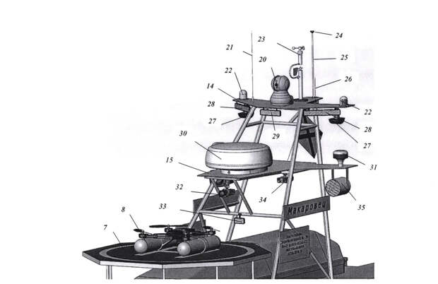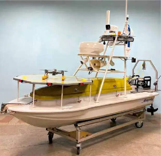 На носу катера монтируется съёмная площадка для беспилотного летательного аппарата. Плоский агрегат оснащён электромагнитами для удержания БПЛА в движении и для упрощения посадки. БЭК способен принимать беспилотники-коптеры небольшого размера и массы.