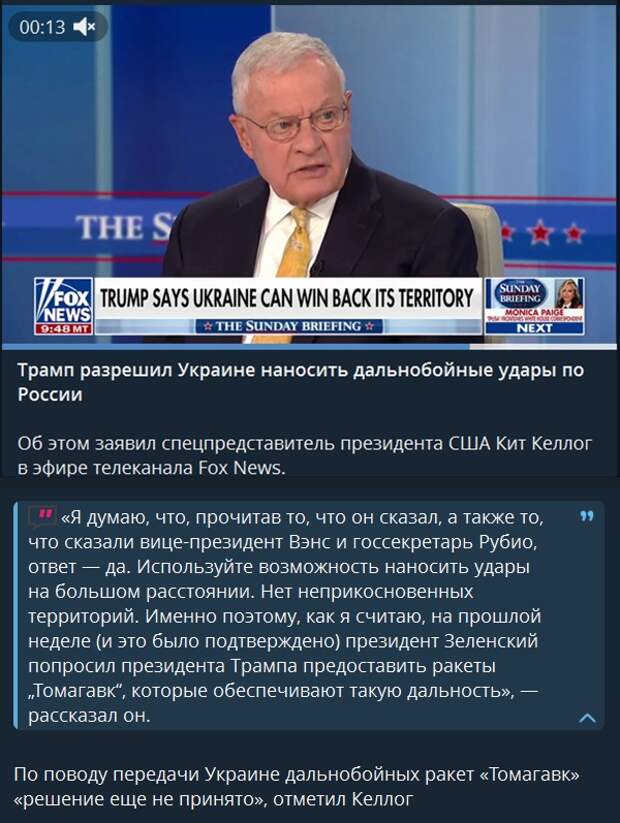 Про передачу Киеву «Томагавков» на мобильных пусковых «Тифон» — согласно заявлению Келлога, со ссылкой на Белый дом, Трамп, якобы, «разрешил [хохлорейху] дальнобойные удары» вглубь российской территории, и «неприкосновенных мест в РФ больше нет».
