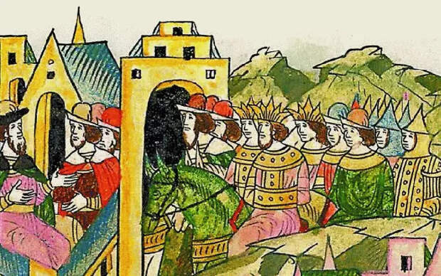 Хан Алегам выезжает из Казани и сдается русским воеводам в 1487 г. Миниатюра из летописи
