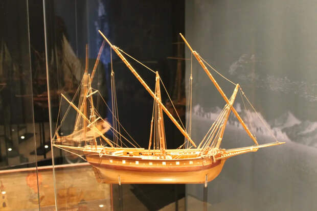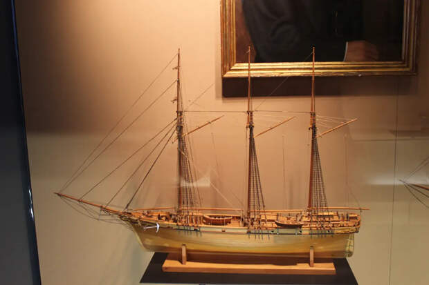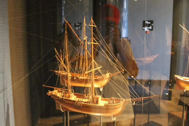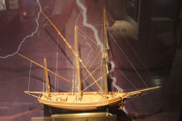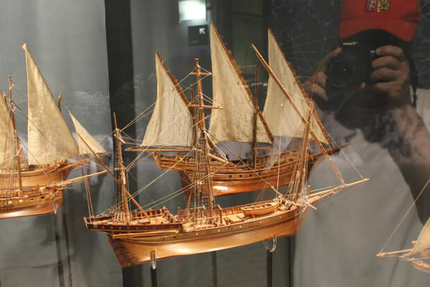 Классическая шебека. Причем интересно, что модели в музее в основном некрашеные, теплого цвета натуральной древесины. При этом в пушечных портах пушек нет, поскольку они металлические и выбивались бы из общего стиля!
