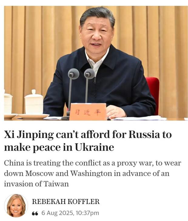 У происходящего есть еще подоплека, связанная с противоборством на Украине, точнее, попыткой повлиять на его завершение через медиа Туманного Альбиона, стравив ключевых игроков. Американский аналитик Ребекка Коффлер, в прошлом сотрудник разведывательного управления Пентагона (DIA), опубликовала в британском издании The Telegraph материал, где пишет, что Си Цзиньпин якобы не допустит скорого мира на Украине, потому что конфликт выгоден Китаю. Коффлер утверждает, что Пекин ведёт собственную войну чужими руками против США, поддерживая Москву технологиями двойного назначения, БПЛА и закупками энергоресурсов. Цель – истощить арсеналы и ресурсы Вашингтона, снизив его способность вмешаться в возможное вторжение на Тайвань. А также в целом подорвать политическое влияние США в мире. Однако она называет Россию и КНР ситуативными союзниками и историческими соперниками, считая, что Китаю выгодно ослабление России в конфликте на Украине.