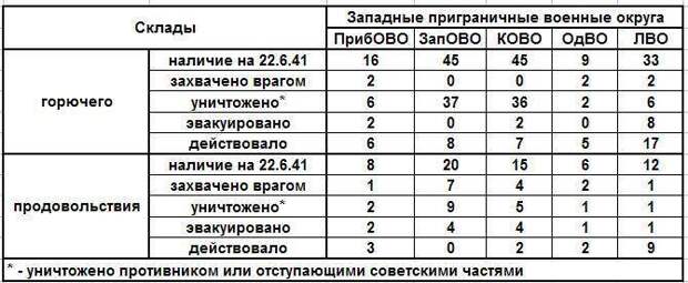 Следует отметить, что по имеющимся данным по потерянным боеприпасам ПрибОВО-СЗФ занимает одно из последних мест. По донесениям Западного фронта с 22.6 по 1.8.41 было подорвано на складах 2700 вагонов, уничтожено вражеской авиацией 655 и захвачено противником 79 вагонов. Юго-Западный фронт с 22.6 по 10.7.41 потерял 2238 вагонов боеприпасов. До 1.08.41 Северный фронт потерял около 386 вагонов, а СЗФ – 110 вагонов. Поэтому «снарядный голод» в войсках СЗФ, против которого действовала одна из самых мощных группировок немецких войск, трудно связать с брошенными складами артвооружения «генералами-предателями». Словосочетание «генералы-предатели» стало модным в среде отдельных писателей и их почитателей. Очень удобная версия. Когда в 30-е годы ломался станок или не выполнялся план по разным причинам - всегда находились «враги», которые это осуществляли целенаправленно... Автор не согласен с такой теорией… Следует отметить, что по складам горючего и продовольствия (захваченным или уничтоженным) по состоянию на 15.7.41 ПрибОВО снова не на первых местах.