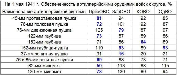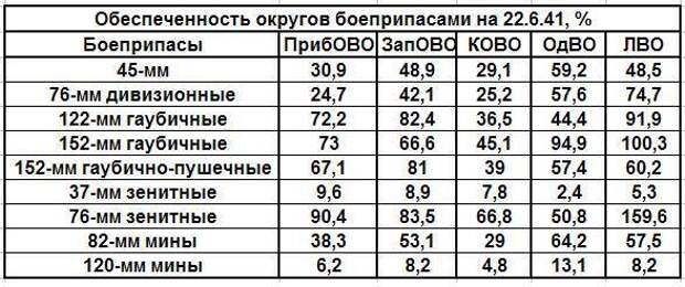В среднем в ПрибОВО положение вырисовывается достаточно неплохое. Исключение составляют выстрелы к 85-мм и 37-мм зенитным пушкам, а также к 120-мм минометам: имеется всего около одного БК к 85-мм зенитным пушкам и к полковым минометам. По этим артсистемам боеприпасов было мало во всех округах.