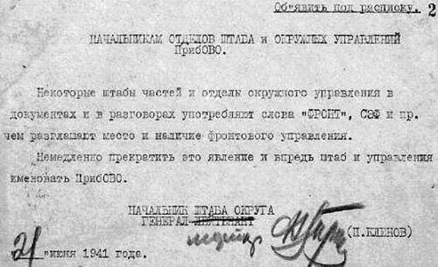 19.6.41 основной состав штаба ПрибОВО перебрасывается на фронтовой командный пункт в район Паневежис. Фактически произошло преобразование ПрибОВО в СЗФ и из его состава выделился урезанный штаб Прибалтийского ВО, который по сути играл роль тылового пункта управления. Сотрудники штаба СЗФ вместо легендированного наименования «ПрибОВО» нередко стали употреблять аббревиатуру истинного наименования «СЗФ». Поэтому было подготовлено распоряжение, подписанное начальником оперативного отдела штаба генералом Трухиным.