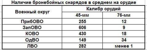 Из таблицы видно, что по обеспеченности шестью типами орудий войска ПрибОВО занимают последнее место. В то же время, по некоторым системам ПрибОВО существенно опережает другие ВО: по 76-мм дивизионным, по 37-мм зенитным пушкам и 152-мм гаубицам-пушкам. Следует отметить, что обеспеченность войск ЗапОВО отдельными типами орудий даже выше, чем у КОВО. Мы снова видим, что при оснащении ВО артиллерией не учитывались направления главных ударов, которые предполагал ГШ. Ниже в таблице представлена обеспеченность бронебойными снарядами орудий калибра 45 и 76-мм на 1.5.41 г. Эта проблема общеизвестна. ПрибОВО снова на 4 и 3-м месте.