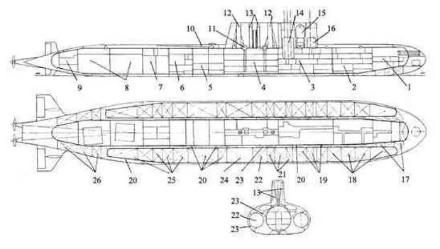 Сведений об этом нереализованном проекте осталось немного, известно, что водоизмещение судна должно было составить около 55 тысяч тонн с полной загрузкой, скорость — 19 узлов, а глубина погружения — до 100 метров. Приводить подлодку (если это сооружение можно так назвать) в движение должны были два водо-водяных ядерных реактора. Была ещё появившаяся тогда же предэскизная проработка проекта атомохода, способного брать 15 тысяч тонн груза, о которой известно ещё меньше.