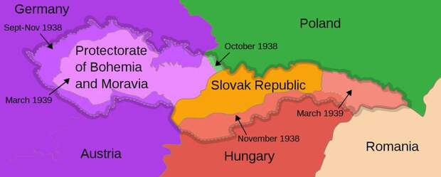 Сразу после Мюнхенского сговора Польша предъявила Праге ультиматум. Польские войска вошли в Тешинскую область, которую в Варшаве считали «исконно польской землёй». Последовало изгнание около 30 тысяч этнических чехов. Неуемность польских аппетитов проявилась и в Словакии: 1 декабря 1938 года под давлением Варшавы Прага уступила ещё 226 кв. км на севере Словакии.