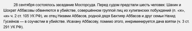 После озвученных цифр дядя убийцы -Бахтияр Аббасов, издал вопль раненой азербайджанской души: «Мы не знали, что вся Россия против нас встанет. Это национализм!».