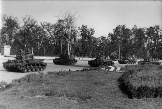 Колонна из 24-х английских средних крейсерских танков А-34 «Комета» из 7-й британской танковой дивизии проходит по площади Большой Звезды в берлинском парке Тиргартен
