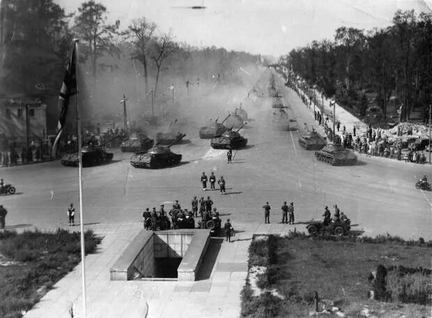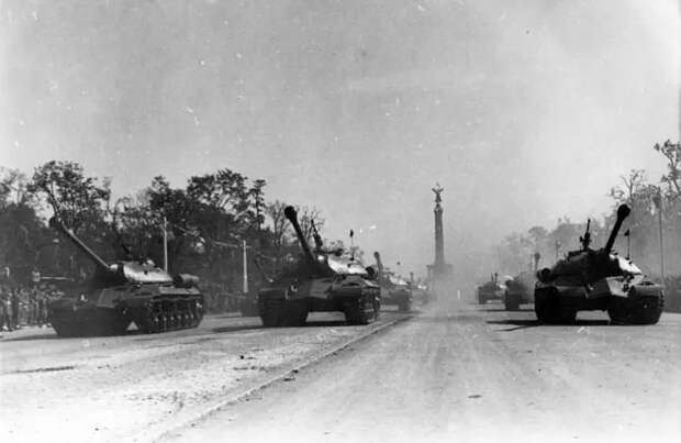 Парад союзных войск в Берлине 7 сентября 1945 года, посвященный окончанию Второй мировой войны. Колонна из 52 советских тяжелых танков ИС-3 из состава 2-й гвардейской танковой армии проходит по Шарлоттенбургскому шоссе