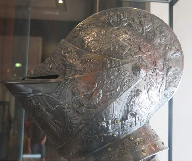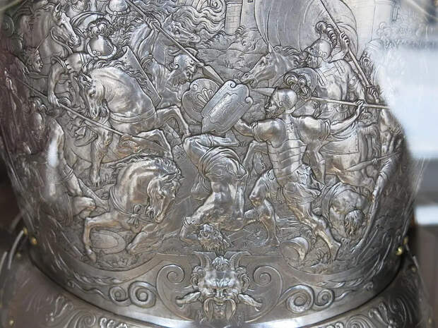 Став королем, Генрих II вкусам не изменил и заказал себе еще один комплект рыцарских доспехов из полированной стали с вычеканенными на них сценами Троянской войны. На первый взгляд они смотрятся беднее предыдущих доспехов, однако при внимательном рассмотрении становится очевидно, что для того, чтобы прочеканить все эти фигуры, требуется просто потрясающее мастерство. Недаром этот королевский доспех выставлен именно в Лувре.
