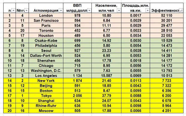 В первой колонке место городов по ВВП (номинал). Москва явно не вторая, а только 16-я. Получаются крайне интересные данные. Самая большая городская экономика мира – Токио – 2 трлн. долл., Нью-Йорк – 1.8 трлн. долл. Но если смотреть по эффективности, безусловным лидером стал Лондон с рейтингом 52 тыс., потом Сан-Франциско – 30 тыс., далее – Париж – 29 тыс. Но если отнести Сингапур в категорию городов, он и здесь будет на первом месте с показателем 139 тыс. А Нью-Йорк, занимая по ВВП второе место, поднялся в рейтинге лишь немногим выше Москвы – 14. Здесь Москва по эффективности использования ресурсов находится на последней строчке, уступая лидерам (Лондон и Сан-Франциско) в 7-10 раз.
