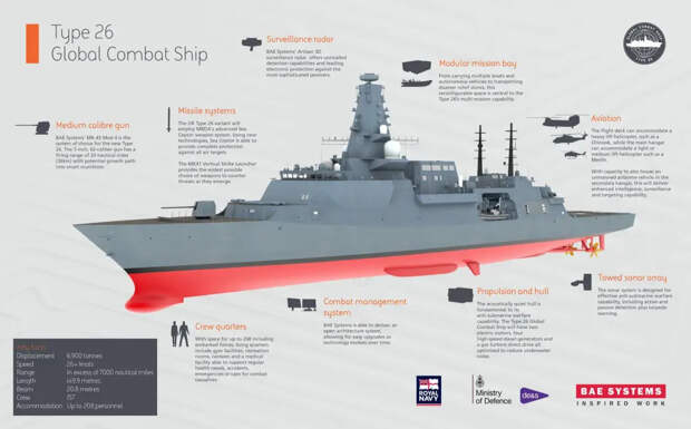 Инфографика, на которой показаны различные ключевые элементы фрегата типа 26. BAE Systems