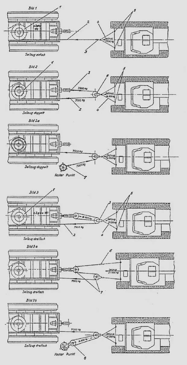 Схемы эвакуации обездвиженного танка. 1. Барабан лебёдки. 2. Трос. 3. Скоба. 4. Соединительный трос для буксирного гака. 5. Буксирные гаки. 6. Полиспаст. 7. Скоба буксирного троса, прикреплённая к анкеру