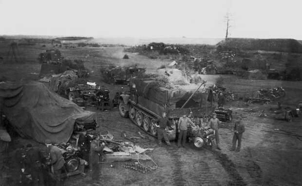 Ремонтный взвод восстанавливает замаскированный танк. На переднем плане 18-тонный тягачРассмотрим подробнее работу эвакуационного взвода, так как именно ему доставалась самая горячая и сложная работа. Взвод эвакуировал транспортные средства напрямую в ремонтную роту или, если расстояние было слишком большим, — на пункт сбора. Позже эти транспортные средства либо эвакуировались дальше в тыл, либо ремонтная мастерская продвигалась вперёд и устанавливала свою новую рабочую зону на пункте сбора.