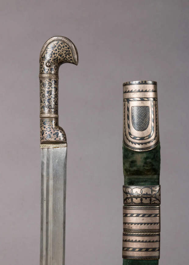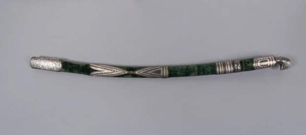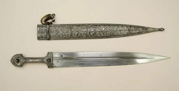 Кавказский кинжал – традиционное оружие горцев и принадлежность их национального костюма, изготовленный в селении Кубачи, в Дагестане. Ок. 1818-1819 гг. Материалы: сталь, серебро, чернь, дерево. Длина: 55,88 см. Метрополитен-музей, Нью-Йорк