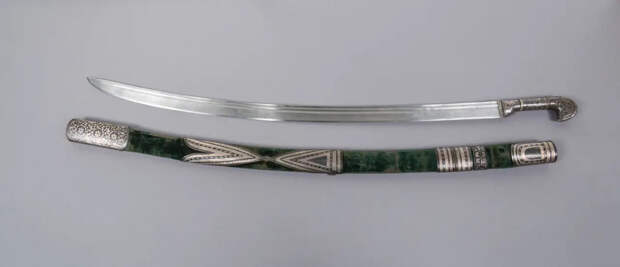 Кавказская шашка с ножнами, ок.1849-1850 гг. Материалы: сталь, серебро, чернь, дерево, текстиль. Длина вместе с ножнами 95,9 см. Вес с ножнами 598,2 г. Метрополитен-музей, Нью-Йорк