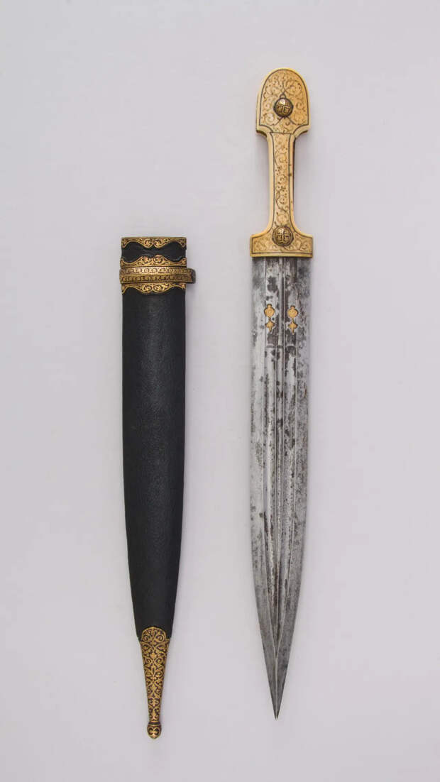 Кинжал с ножнами, кавказской работы, 1860-1861 гг.Материалы: сталь, золото, серебро, слоновая кость, кожа. Длина: 47.8 см. Метрополитен-музей, Нью-Йорк