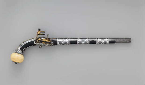Кавказский, возможно, грузинский или черкесский пистолет 1846–1847 гг. На стволе имеются надписи на русском и арабском языках, что позволяет предположить, что пистолет был изготовлен в Тбилиси (Грузия или Черкесия), которые в то время находились под контролем России. Кубачи, другой крупный центр оружейного дела на Кавказе, оказался под властью России только в 1860-х годах. Кремневый замок средиземноморского типа – «микелет». Материалы: сталь, золото, серебро, чернь, кожа, слоновая кость. Длина 44,45 см. Метрополитен-музей, Нью-Йорк