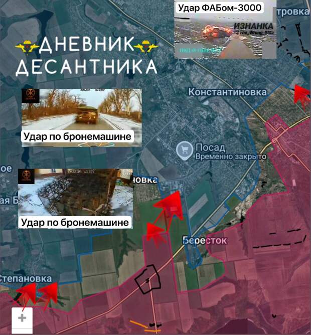 В районе Степановки и Ильиновки наши войска наносят удары по логистике ВСУ. Также идёт перерезание логистических маршрутов противника на западной окраине Константиновки в Ильиновке. В Константиновке севернее Шанхайского ставка зачищен лесной массив, что позволило нашим войскам подойти к ряду укреплений на восточной окраине города.