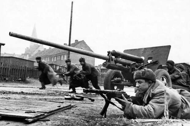 Расчёт орудия ЗиС-2 и штурмовая группа в боях за Кёнигсберг. Апрель 1945 года