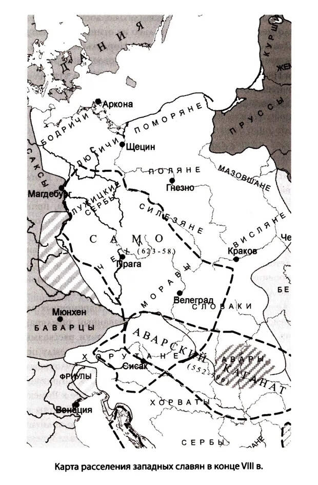 Временное ослабление аварского кагана в середине VII в., после неудач во время военных походов против Византии, позволило покоренным этносам, кочевникам тюркам (болгарам) и славянам, начать с ними борьбу. Результатом ее стало образование первого славянского прогосударственного образования Само. Как раз в южном течении Моравы и районе, где она впадает в Дунай, земли современной Словакии и Австрии. Это подтверждается и археологически: в западной части Моравы нет следов авар.
