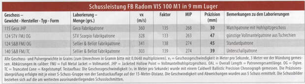 Отстрел проводился четырьмя сортами патронов с массой пули от 115 до 140 гран. Стрельба велась на дистанцию 15 метров с опорой на мешок с песком. Среднее рассеивание составило ок. 40 мм. Наилучшие результаты показали патроны GECO 115 гран с экспансивными пулями. Рассеивание составило 30 мм. На втором месте оказались S&B 140 гран с результатом 39 мм. Замыкают список S&B 124 FMJ и STV Scorpio 124 FMJ с результатом 45 и 47 мм соответственно.