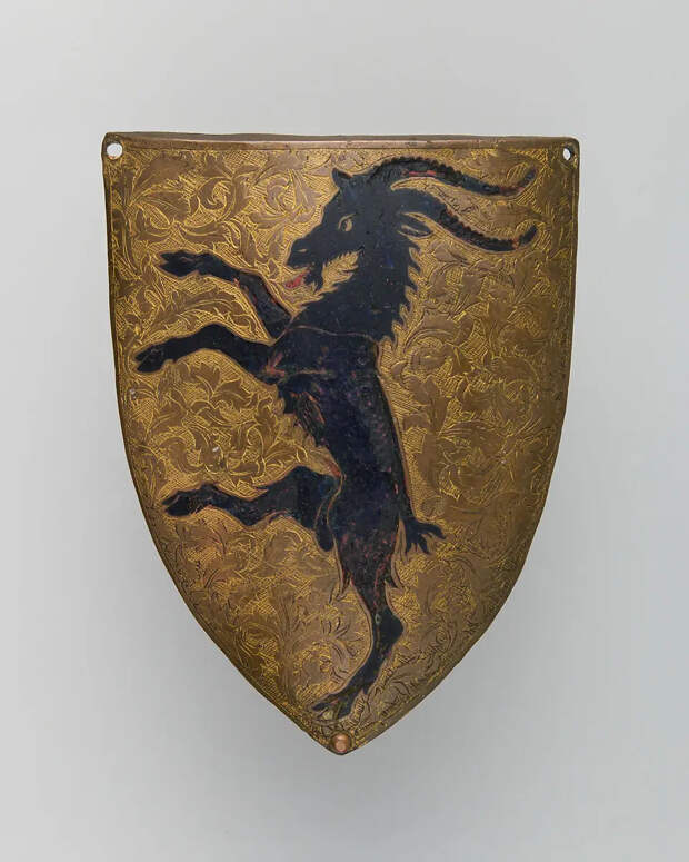 На щите герб, принадлежащий либо семье Готсманн, либо родственной семье Тюрригель, оба из Франконии. Девиз на немецком языке: HAB MYCH ALS ICH BIN... (Прими меня таким, какой я есть...). Украшение с его яркими цветами на серебряном фольгированном фоне удивительно хорошо сохранилось, поскольку оно было скрыто в течение столетий под слоями более поздней краски. На кожаной подкладке задней части щита видны следы раскрашенной фигуры Святого Христофора, чье изображение, как считалось, защищает от внезапной смерти. Материалы: дерево, кожа, лен, гипс, пигменты, серебро. Длина 55,88 см. Ширина 40,64 см. Вес 2159 г.