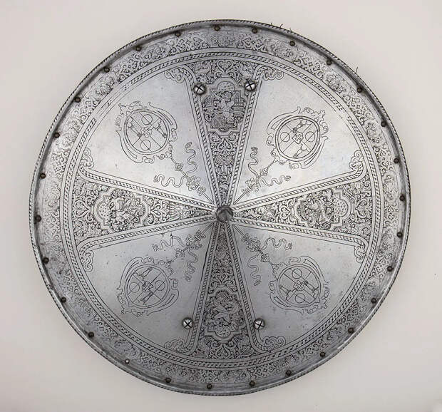 Этот стальной щит для пехоты имеет тонко протравленные сегменты с гербом великого герцога Маркантонио Колонна (1535–1584), чередующиеся с фигурами из классической мифологии. Первоначально он был частью более крупного гарнитура – набора сменных элементов доспехов для человека и его лошади (сейчас в коллекции Музея искусств Кливленда). Ансамбль представлял образ носителя как богатого и образованного человека. Материалы: сталь, медный сплав (латунь), кожа, конский волос, текстиль. Диаметр 55,2 см. Вес 3895 г.