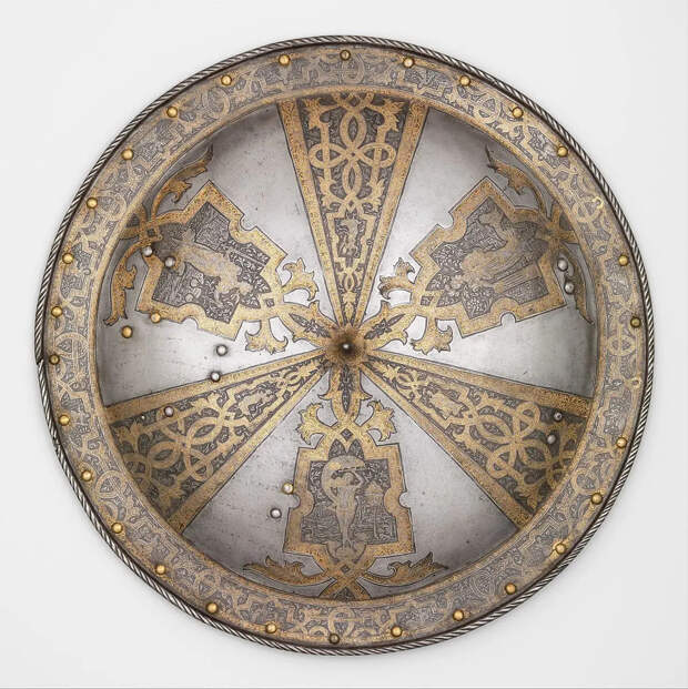 И долгое время щиты меня совсем не интересовали, пока в журнале «Техника-молодежи» за 1980 год не прочитал статью историка Прищепенко, где было написано, что на Руси в каждом крестьянском доме на стене висел дубовый щит! Начал смотреть журналы «Советская археология», а там статья о щитах, найденных в болотах Прибалтики. Все из липовых дощечек, обшитые кожей, и даже с деревянными умбонами, копирующими формой железные! Ну а потом каких только щитов не пришлось увидеть, включая знаменитый ацтекский щит из перьев, попавший в сокровищницу императора Карла V, и который ныне экспонируется во дворце Новый Ховбург в Вене, в императорском арсенале. Ну а сегодня мы продолжим знакомиться со щитами из экспозиции музея Метрополитен в Нью-Йорке…