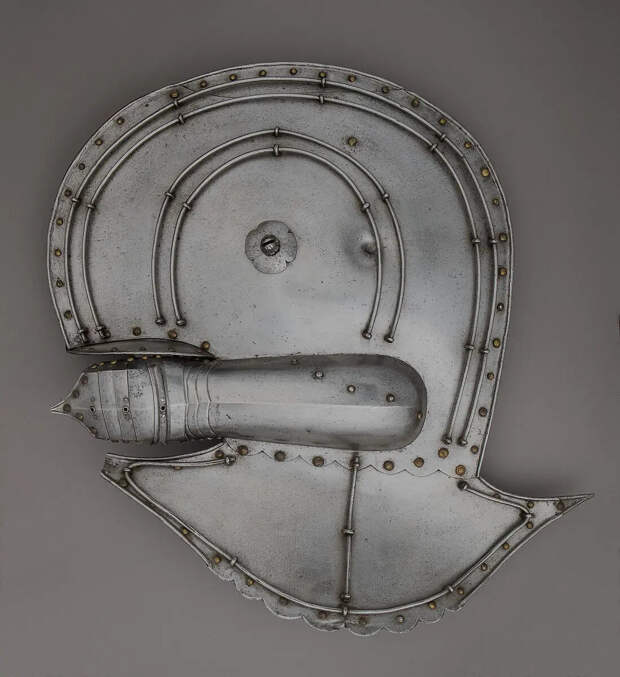 Этот необычный щит имеет элемент, похожий на перчатку, встроенную прямо в его корпус, который закрывал руку пользователя и поддерживал вес щита. Выступающие планки на нем могли поймать острие меча противника. Некоторые похожие образцы имеют прикрепленные к ним клинки мечей. На первый взгляд этот щит весьма непрактичен, для фехтования или защиты неудобен, по размерам он слишком большой и тяжелый, да еще и неправильной формы. Но, возможно, он был предназначен для создания устрашающего облика воина, нежели для его серьезной защиты. Материалы: сталь, латунь, кожа. Длина 71,75 см. Ширина 63,18 см. Вес 5896,7 г.