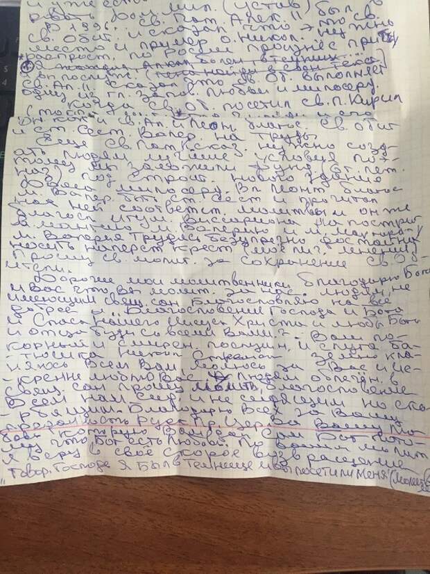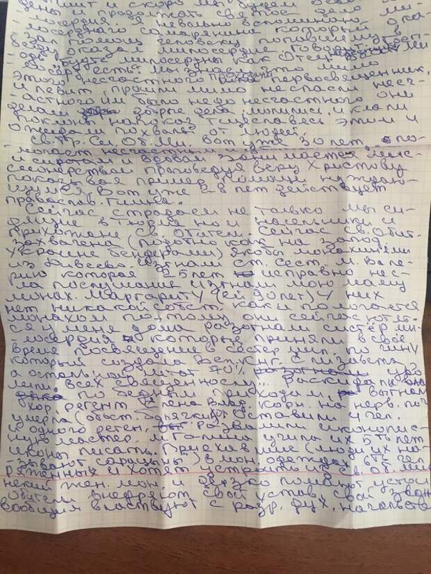 Дорогие богомольцы, друзья, братья и сестры, искренне благодарю Бога и вас за ваши молитвенные за нас – меня, батюшку Николая, и дочь Елену, о нашем скорейшем освобождении. Поверьте, я чувствую (или ощущаю) ваши молитвы и воздыхание, ваше терпение и вашу веру в то, что Бог всё слышит, и скоро мы будем освобождены, <будем> продолжать святое дело милосердия. Я невольно вспоминаю милосердного самарянина, который оказал помощь человеку, попавшему в беду, оказал милосердие. Говорит Господь: «Будьте милосердны, как Отец Небесный ваш милосерд есть». Мы знаем, что мимо этого несчастного проходили <перво> священник и левит, прошли мимо, не спасли несчастного, им было не до несчастного, они делали добрые дела, молились и клали поклоны напоказ, тщеславясь этим, и ждали похвалы от людей.