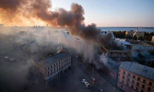 Горящее после российского удара здание ТЦК на территории завода «Стальканат» в Одессе