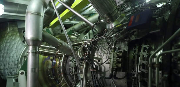 Прим. Конечно, в таком виде турбину на корабль не поставишь. Ее надо одеть тепло- и звукоизоляционным кожухом, приделать воздухозаборник и выпускной коллектор горячих газов, поставить на фундамент и добавить туда же вспомогательные устройства. Тогда она станет газотурбинным двигателем.