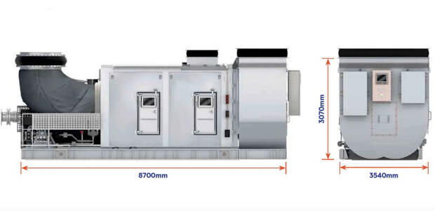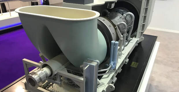 На этом снимке «живой» газотурбинный двигатель на основе турбины МТ30 авианосца HMS Prince of Wales. ГТД включает в себя корпус и вспомогательное оборудование, и в сборе весит около 30 тонн. В виде единого узла вместе с опорным фундаментом он может быть установлен с помощью одного подъемника (желтая рельса вверху)